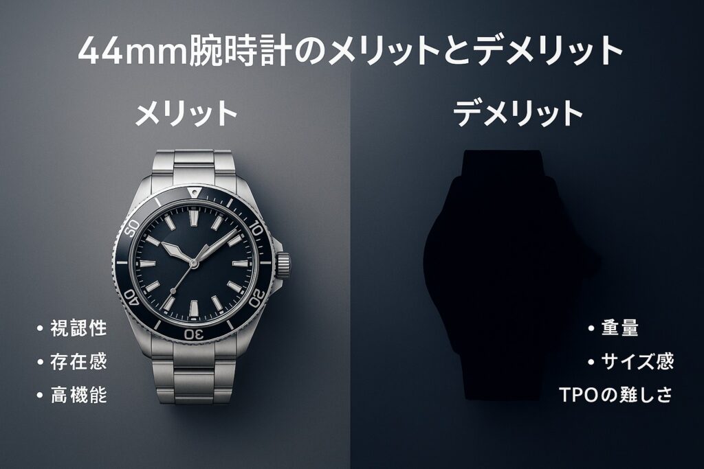 ビジネスシーンやフォーマルな場では、44mmの時計は少し目立ちすぎる場合があります。特に袖の細いスーツでは、時計が生地に引っかかったり、袖口から飛び出して見えたりすることも。こうした場合は、薄型ケースやクラシックデザインの44mmモデルを選ぶことで、上品さを保ちながら存在感を活かせます。TPOを意識して時計を使い分けることが、大人の時計選びのポイントです。