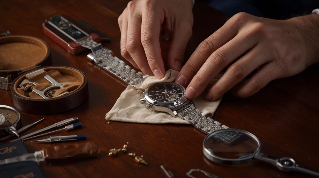 磁気の強い場所を避け、防水性を過信しないことが大切です。特にパソコンやスマートフォン、スピーカーなどの近くに長時間置くと磁気の影響で精度が狂う恐れがあります。さらに、防水時計であっても温泉やシャワーなどの高温多湿環境ではパッキンが劣化しやすく、内部に水分が侵入するリスクが高まります。そのため、水に関わるシーンでは極力外すのが安全です。使用後は柔らかい布で汚れや汗を丁寧に拭き取り、特に金属ブレスレットの場合は細部に汚れが溜まりやすいため、柔らかいブラシで優しく掃除するのもおすすめです。こうした日常のちょっとしたケアを習慣化するだけで、時計の寿命や外観の美しさが大きく変わってきます。
