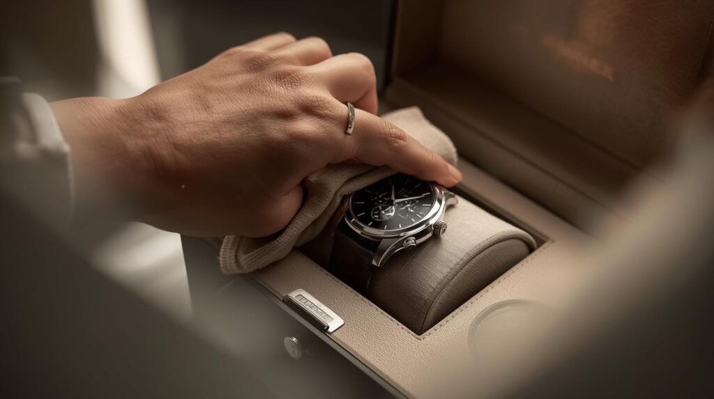 時計を収納する前に乾いた布で軽く拭くだけで、表面に付着した汗や皮脂、ホコリを取り除けるため、汚れの蓄積や金属部分の腐食、革ベルトの劣化を効果的に防ぐことができます。特に肌に直接触れる腕時計は汚れが残りやすいため、わずか数十秒のひと手間が、その後のコンディションに大きく影響します。こうした日々のケアを積み重ねることで時計の寿命を大きく左右し、美しさと機能性の両方を長期間キープすることにつながります。